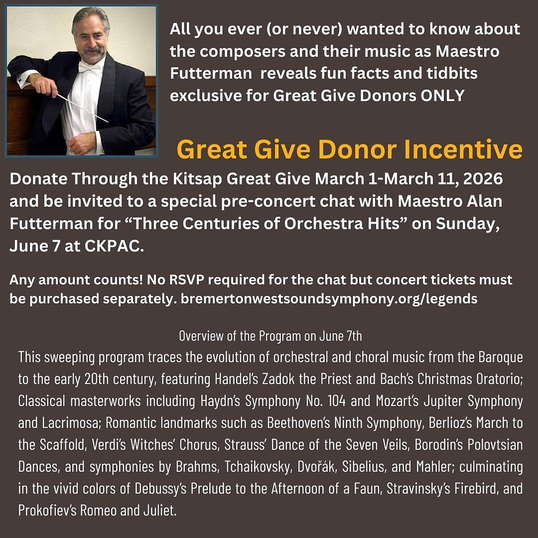 Our vision is for the West Sound to flourish as a hub for local arts and creativity, fostering connections among citizens of all ages and providing a vibrant home for music within a thriving local economy. This vision is only possible because of you—our loyal donors and patrons. Your unwavering generosity drives us forward, allowing us to bring timeless music into the present and inspire future generations.
