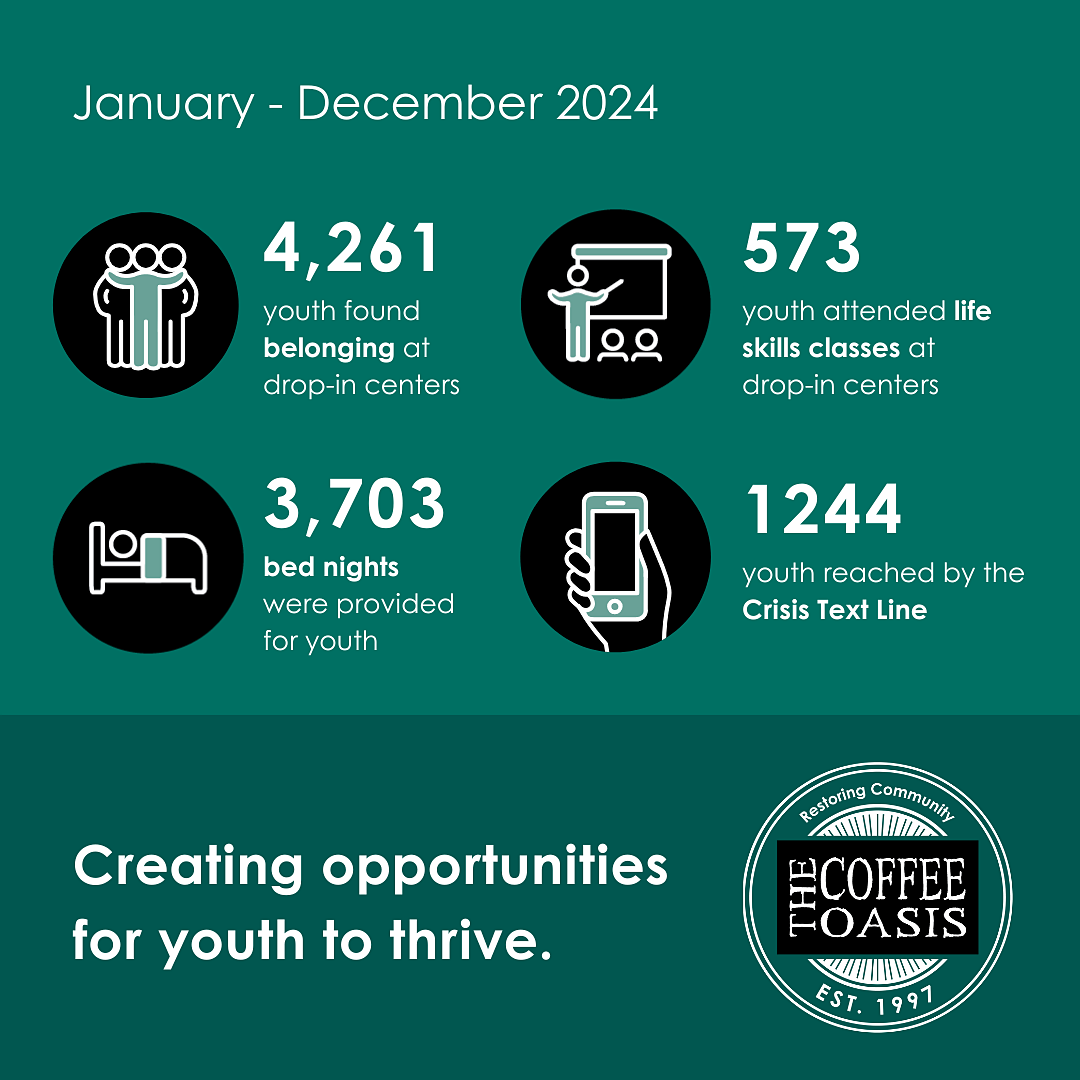 Since 1997, The Coffee Oasis has provided shelter, safety, and mentorship to youth (ages 13-25). In uncertain times, our community donors provide foundational support for youth seeking resources.